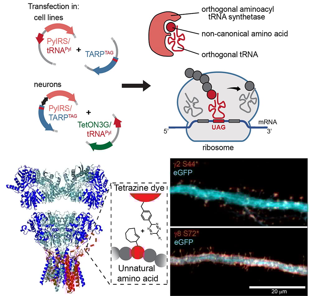 Bas : Structure cristallographique d’un récepteur AMPA tétramérique (gauche, sous-unités bleu et vertes) associé à deux protéines auxiliaires TARP g8 en rouge. La boucle extracellulaire en pointillé est non-structurée et donc non résolue au niveau structural. Son interaction étroite avec le récepteur AMPA empêche son marquage avec un anticorps ou son étiquetage avec une protéine fluorescente. En insérant un codon Stop TAG dans la séquence de g8 au niveau de cette boucle, et en fournissant aux neurones un acide aminé non naturel correspondant à la machinerie de traduction citée en haut, on peut faire incorporer cet acide aminé non naturel à la protéine et le marquer avec un fluorophore par chimie clic (tetrazine dye). A droite, on voit en rouge les TARP g2 et g8 dans deux dendrites exprimant également la GPF pour en révéler la forme. Notez la distribution distincte de g2 et g8.