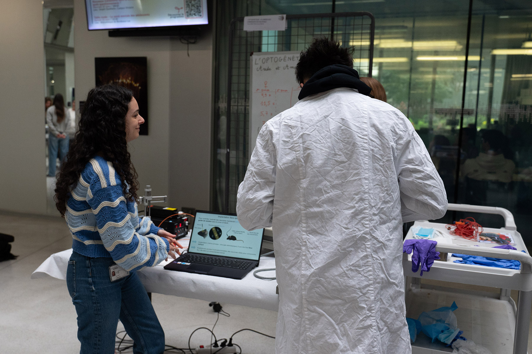 Enfin, l’après-midi, les élèves ont participé à deux ateliers. Une vingtaine d’activités était proposée, avec une grande variété de sujets – addiction, cancer, épilepsie, comportement alimentaire, AVC, étude de la mémoire chez la souris, apprentissage sensorimoteur chez les oiseaux – et d’approches – modélisation, microscopie, expériences immersives, quiz…