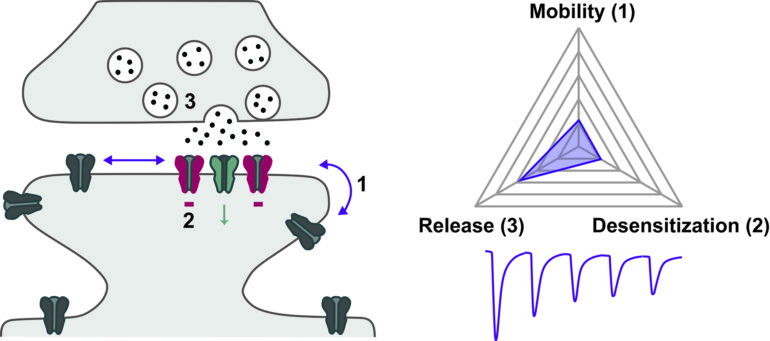 Leur mobilité permet alors à des récepteurs « neufs » de remplacer ceux devenus moins efficaces, maintenant ainsi la transmission du signal. Lorsque ce mouvement est bloqué, les récepteurs fatigués restent piégés dans la synapse : la transmission diminue plus fortement, et la synapse agit comme un frein.