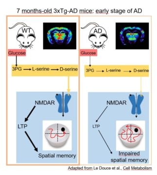 Une étude collaborative a montré chez une souris modèle de la maladie d’Alzheimer que la diminution de la consommation de glucose par les astrocytes conduit à une réduction de la production de L-sérine, un acide aminé majoritairement produit par ces cellules dans le cerveau et dont la voie de biosynthèse est altérée chez les patients. La L-sérine est le précurseur de la D-sérine, connue pour stimuler les récepteurs NMDA, essentiels au bon fonctionnement du cerveau et à l’établissement de la mémoire. Dès lors, en produisant moins de L-sérine, les astrocytes sont à l’origine d’une diminution de l’activité de ces récepteurs, ce qui entraîne une altération de la plasticité neuronale et des capacités de mémorisation associées. Les scientifiques ont également démontré que les fonctions de mémorisation des souris ont toutes été restaurées par un apport alimentaire en L-sérine.