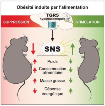 Au-delà de cette action au niveau des organes périphériques, notre étude montre que les acides biliaires circulants peuvent aussi atteindre l’hypothalamus, une structure du cerveau qui joue un rôle clé dans la régulation du poids et du métabolisme de l’organisme entier. Cette structure cérébrale exprime elle aussi des récepteurs TGR5. Chez des souris rendues obèses, le système de détection hypothalamique des acides biliaires parTGR5 est défectueux et l’activation pharmacologique des récepteurs TGR5 cérébraux amène à une diminution du poids et de la masse grasse. Ces bénéfices sont obtenus grâce à une augmentation de l’activité du système nerveux sympathique (SNS) qui accroit la dépense énergétique. Au contraire, l’inhibition de l’expression et de l’activité des récepteurs TGR5 dans des neurones de l’hypothalamus facilite le développement et la progression de l’obésité. Ainsi, le système hypothalamique de détection des acides biliaires par TGR5 nous protège de l’obésité.