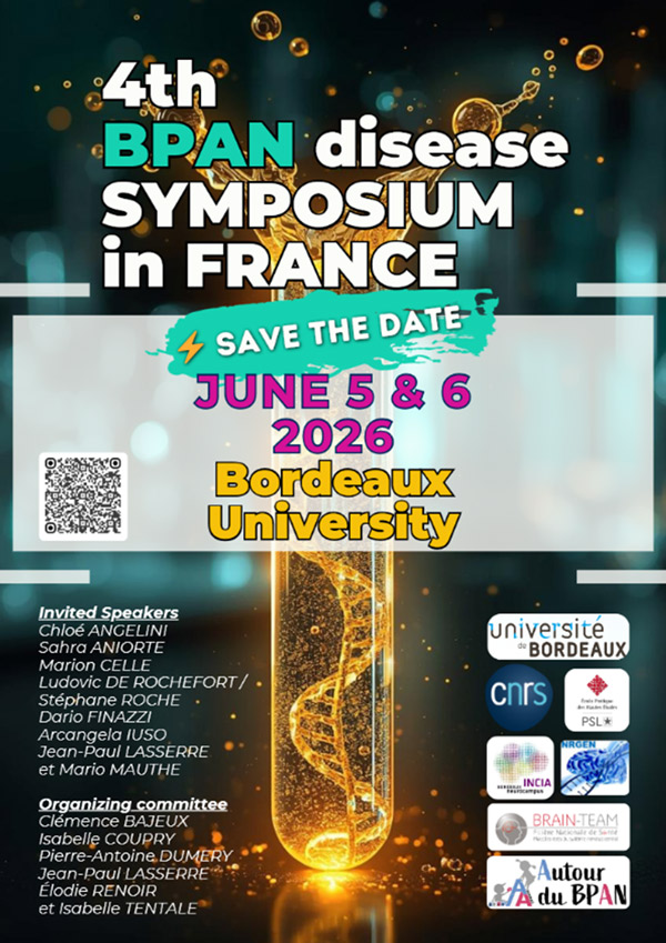 This is the 4th symposium on BPAN disease organized by the Association “Autour du BPAN” and the NRGen Team (Translational Research on Neurodegenerative Diseases) from INCIA, Bordeaux.