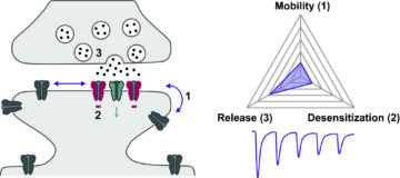 On the right, a Shapley diagram, coming from the game theory, helps estimate the respective contributions of receptors’ mobility (1), their desensitization (2) and the potential glutamate release (3) on the evolution of short-term synaptic plasticity.