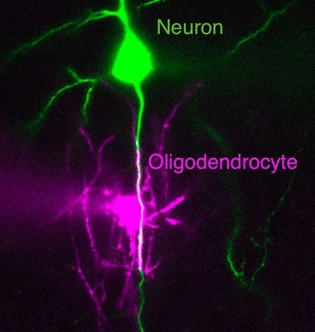 Myelin sheaths, the fatty cellular processes produced by oligodendrocytes, electrically isolate axons and provide nutrients to long range projection axons. The formation of myelin is a complex process that requires the interplay of neurons and oligodendrocytes and continues long into adulthood. In humans, this period of myelin formation continues into the 3rd decade of life.
