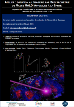 Organisé par l’unité CBMN (Chimie et Biologie des Matérieux et des Nanoparticules) et la plateforme Bordeaux Protéome, l’atelier « Initiation à l’Imagerie par Spectrométrie de Masse MALDI Appliquée à la Santé » a pour but de vous faire découvrir la mise en place de protocoles d’imagerie MALDI et au traitement de données associées. Ce workshop est l’occasion de vous sensibiliser, tant sur le plan théorique que pratique, à l’imagerie par spectrométrie de masse, méthodologie qui permet d’étudier :