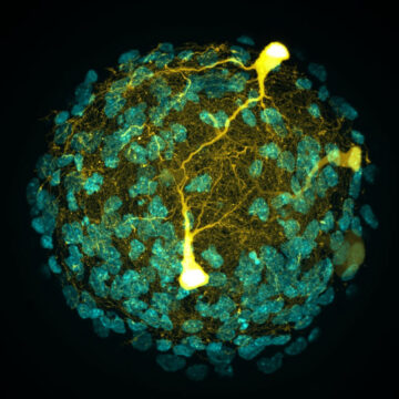 In July, the Image of the Month award goes to Adèle Drouet of the MAP team (Mechanisms of Adaptive Processes in Brain Circuits) at IINS (UMR 5297). This image represents a neurosphere (150×150 µm) formed from dissociated hippocampal neurons cultured for 14 days under non-adhesive conditions. The team uses this model to investigate the role of the adhesion molecule neuroligin-1 in synapse formation, through knockdown or overexpression approaches. Neurons expressing shRNA-GFP (electroporated at DIV 0) are shown in yellow. Nuclei of all cells within the sphere are counterstained with DAPI (cyan).