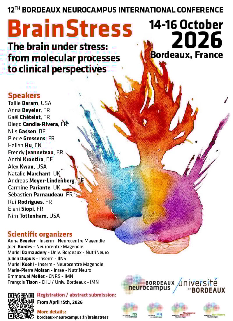 The 12th edition of our Bordeaux Neurocampus international conferences, BrainStress, will take place on October 14th to 16th, 2026 at the Centre Broca Nouvelle-Aquitaine.