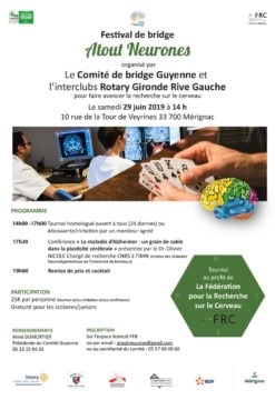 Les activités intellectuelles ont un rôle protecteur pour le cerveau : plus on utilise son cerveau, moins il s’abime. C’est pourquoi la FRC et le Comité de Guyenne de Bridge s’associent pour vous proposer la Semaine et le Festival Atout Neurones. Le Comité de Guyenne de Bridge organise, du 24 au 29 juin, en partenariat avec la FRC et le Rotary International, la Semaine ATOUT NEURONES. Une semaine pendant laquelle plusieurs clubs de bridge du Comité sont conviés à organiser localement un tournoi au profit de la Recherche sur le Cerveau.