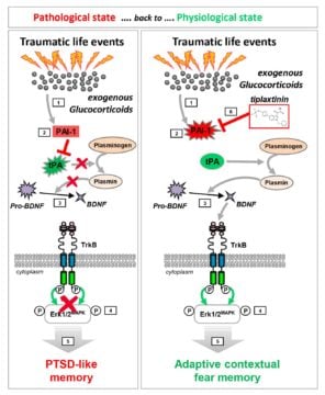 Glucocorticoid hormones (GC) have been proposed as one of the biological systems involved in the transition from adaptive to pathological PTSD-like fear memory. In this collaborative paper with Aline Desmedt’s team, we have shown that the deregulation in the hippocampus of the GR-tPA-BDNF-TrkB-Erk1/2MAPK-Egr-1-Synapsin-I (GMES) signaling cascade via the increase of type-1 Plasminogen Activator Inhibitor (PAI-1), induced by intense or traumatic stress and GC, is responsible for the formation of a pathological memory modeling important aspects of PTSD. We have shown that pharmacological inhibition of PAI-1 activity prevented PTSD-like memory formation.