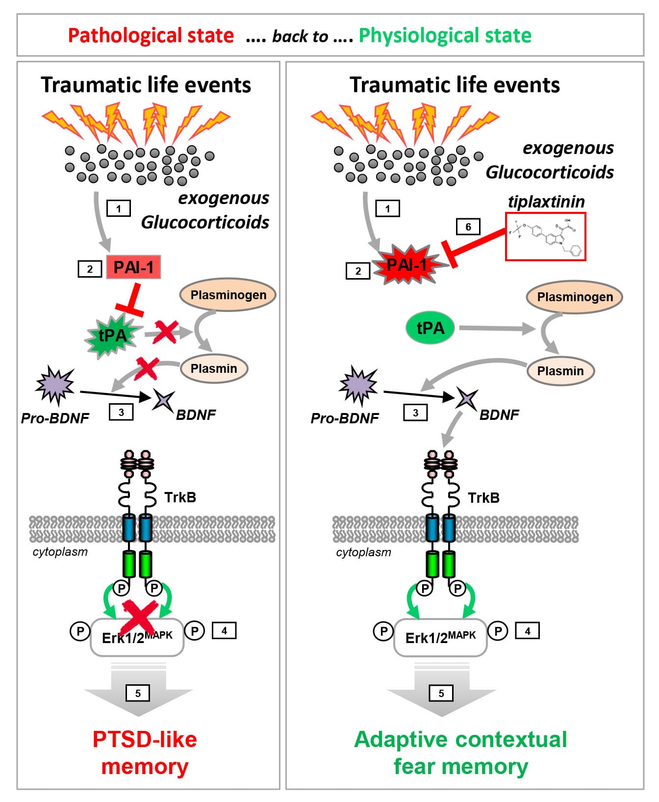 Glucocorticoid hormones (GC) have been proposed as one of the biological systems involved in the transition from adaptive to pathological PTSD-like fear memory. In this collaborative paper with Aline Desmedt’s team, we have shown that the deregulation in the hippocampus of the GR-tPA-BDNF-TrkB-Erk1/2MAPK-Egr-1-Synapsin-I (GMES) signaling cascade via the increase of type-1 Plasminogen Activator Inhibitor (PAI-1), induced by intense or traumatic stress and GC, is responsible for the formation of a pathological memory modeling important aspects of PTSD. We have shown that pharmacological inhibition of PAI-1 activity prevented PTSD-like memory formation.
