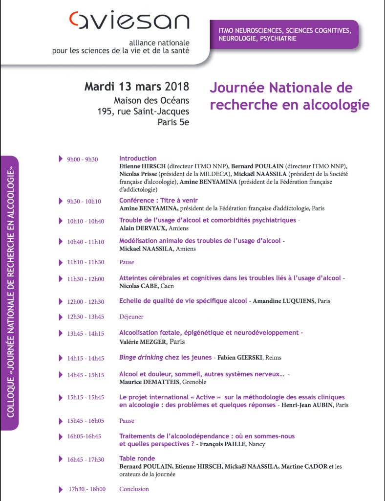 Symposium: National Day of Alcohol research Organised by Aviesan, l’alliance nationale pour les sciences de la vie et de la santé. In French Tuesday March 13, 2018. Maison des Océans – 195 Rue Saint Jacques, Paris 5 Publication: 12/03/18 Last update 21/03/18