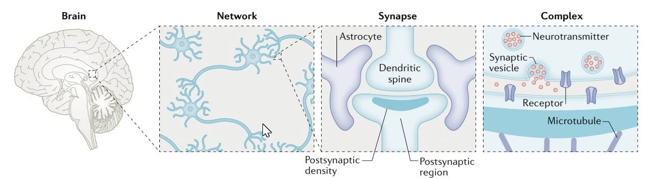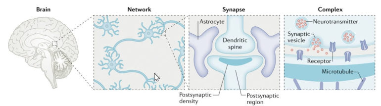 The different levels of complexity of the structures composing the brain are shown from the whole brain down to the molecular level, going through the neural network and synaptic levels.