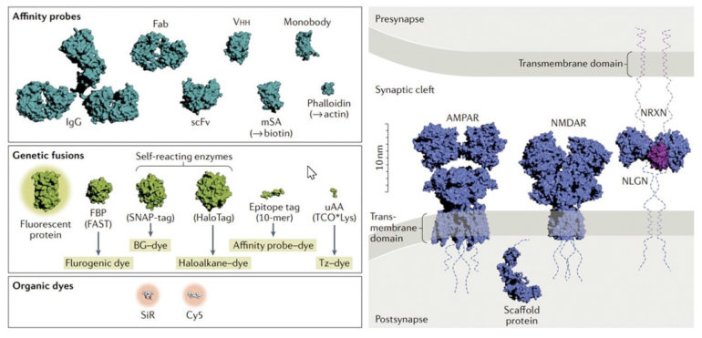 Left: Molecular structures of common affinity probes, tags (genetic fusions), organic dyes and representative neuronal targets all represented on the same scale. To image affinity probes, these are generally further functionalized with particles (not shown, from ~5 nm to a few tens of nanometres), fluorescent proteins or organic dyes. Affinity probes can either be developed against any protein target or be specific for a molecular target (specified in parentheses). Genetic fusion tags either are intrinsically fluorescent (fluorescent proteins) or require the addition of a fluorescent or fluorogenic module. Right: Illustrative neuronal targets consist of glutamate receptors, adhesion protein complex and scaffold proteins (dashed lines represent the non-resolved part of the complexes) represented in the confined environment of the synaptic cleft (~20–25 nm). The respective sizes of the various probes and targets in their biological context provide insights into the impact of the labelling strategy on parameters such as target accessibility, labelling density, distance between the fluorophore and the target (or linkage error) and impact on target function. Structures were obtained from the Protein Data Bank (IgG antibody, 1IGT; monovalent antibody fragment (Fab), 6NJM; single-chain variable fragment (scFv), 6J9O; single-domain antibody or nanobody (Vhh), 3G9A; monomeric streptavidin (mSA), 4JNJ; monobody, 3K2M; phalloidin, 6T25; fluorescent protein (GFP), 3G9A; fluorogen-based probe (FBP) FAST, 1NWZ; SNAP-Tag, 3KZY; HaloTag, 5UY1; epitope tag, 5IVN; trans-cyclooct-2-ene-derived lysine (TCO*Lys), 6AAO; AMPA receptor (AMPAR) complex, 6NJM; NMDA receptor (NMDAR), 6MMA; neuroligin (NLGN)–neurexin (NRXN) complex, 3BIW; scaffold protein (PSD95), derived from 2XKX, 3GSL, 3JXT, and 1JXO). BG, benzylguanine; 10-mer, 10-base oligonucleotide; Tz, tetrazine; uAA, unnatural amino acid.