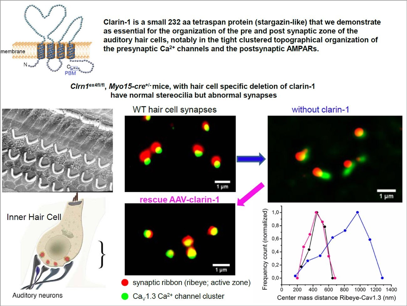 By ensuring a tight coupling between the synaptic ribbons and the CaV1.3 calcium channels at the synaptic active zones of inner hair cells, clarin-1 plays an essential role in organizing the morphology and functional efficacy of this synapse, which is responsible for encoding the microphonic potential into electrical impulses along the auditory nerve fibers. Clarin-1 is also shown to be essential for the post-synaptic organization of the AMPARs and the survival of the afferent auditory nerve fibers.