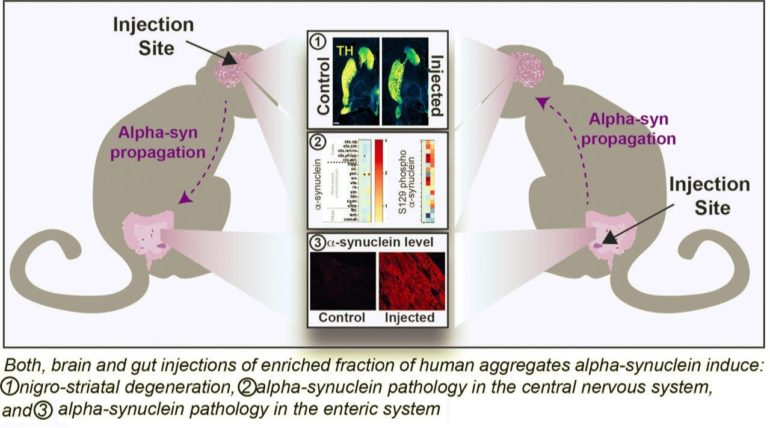 3- When the aggregates were injected into the brain, pathologic form of alpha-synuclein was observed both in the brain and in the enteric system and vice-versa. These results indicate that both brain and gut injections of aggregates can induce α-synuclein pathology in the enteric system, demonstrating the bidirectional long-distance propagation of α-synuclein pathology between the brain and the gut in the non-human primate.