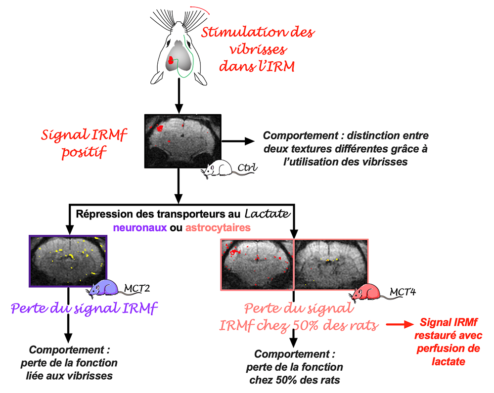 Bien que de nombreuses évidences accumulées au cours des dernières années semblent soutenir l’existence de cette navette, le sujet demeure controversé. Le point critique est de pouvoir démontrer que ce transfert de lactate entre astrocytes et neurones 1) est bien réel in vivo, et 2) est nécessaire à l’activation et à la fonction cérébrale. Pour cela, un modèle a été mis au point chez le rat adulte. L’expression de certains transporteurs aux monocarboxylates, responsables du transport de lactate, a été réprimée de manière sélective, soit dans les astrocytes, soit dans les neurones. Cette répression a été réalisée dans la zone dite des tonneaux (cortex somatosensoriel), région cérébrale impliquée dans la détection des objets via l’utilisation des moustaches (ou vibrisses) du rat. Sur ces animaux modifiés génétiquement, de la spectroscopie in vivo, de l’imagerie fonctionnelle et une tâche cognitive, ciblant toutes cette même zone cérébrale (liée à la stimulation des vibrisses), ont été réalisées. Lorsque le transporteur au lactate neuronal est réprimé, les résultats indiquent clairement que les signaux du couplage neurométabolique (augmentation du lactate en spectroscopie RMN fonctionnelle in vivo) et du couplage neurovasculaire (signal dépendant du niveau d’oxygénation cérébrale “BOLD” en IRM fonctionnelle) sont perdus. D’autre part, la capacité des animaux à discriminer des objets grâce à leurs vibrisses est aussi complètement altérée (perte de reconnaissance entre deux objets identiques de textures différentes). La répression du transporteur au lactate astrocytaire, quant à elle, induit une perte du couplage neurométabolique, mais seulement une perte partielle du couplage neurovasculaire (et de la fonction), signal BOLD qui peut être restauré lors de perfusion de lactate.