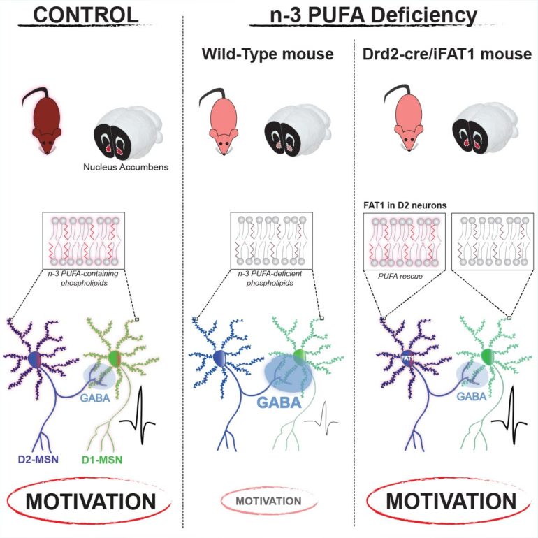 In this context, consistent clinical findings reveal that a shared endophenotype of MDD, BP and SCZ is an alteration in lipid metabolism, and polyunsaturated fatty acids (PUFA) in particular. PUFAs are major components of cell membrane phospholipids where they can modulate membrane properties, act as second messengers and impact the activity of transmembrane and membrane-associated proteins. Herein, we asked if the decrease in n-3 PUFAs, consistently described in these pathologies, could underlie reward-processing deficits. We show that n-3 PUFA deficiency from gestation to adulthood leads to selective motivational impairments. At the neurobiological level, this is related to enhanced lateral inhibition of medium-sized spiny neurons expressing the dopamine D2 receptor (D2R-MSN) onto D1 receptor-expressing MSNs in the ventral striatum, due to increased target projections of D2R-MSNs. Using a unique transgenic mouse model, we show that selectively restoring n-3 PUFA levels in D2R-expressing neurons – but not D1R-expressing cells – during the perinatal period is sufficient to prevent both the rewiring of MSN networks and the motivational deficit.