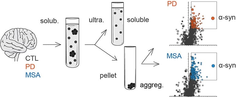 Aggregated alpha-synuclein (α-syn) is a principal constituent of Lewy bodies (LBs) and glial cytoplasmic inclusions (GCIs) observed respectively inside neurons in Parkinson’s disease (PD) and oligodendrocytes in multiple system atrophy (MSA). Yet, the cellular origin, the pathophysiological role, and the mechanism of formation of these inclusions bodies (IBs) remain to be elucidated. It has recently been proposed that α-syn IBs eventually cause the demise of the host cell by virtue of the cumulative sequestration of partner proteins and organelles. In particular, the hypothesis of a local cross-seeding of other fibrillization-prone proteins like tau or TDP-43 has also been put forward. We submitted sarkosyl-insoluble extracts of post-mortem brain tissue from PD, MSA and control subjects to a comparative proteomic analysis to address these points. Our studies indicate that: i) α-syn is by far the most enriched protein in PD and MSA extracts compared to controls; ii) PD and MSA extracts share a striking overlap of their sarkosyl-insoluble proteomes, consisting of a vast majority of mitochondrial and neuronal synaptic proteins, and (iii) other fibrillization-prone protein candidates possibly cross-seeded by α-syn are neither found in PD nor MSA extracts. Thus, our results (i) support the idea that pre-assembled building blocks originating in neurons serve to the formation of GCIs in MSA, (ii) show no sign of amyloid cross-seeding in either synucleinopathy, and (iii) point to the sequestration of mitochondria and of neuronal synaptic components in both LBs and GCIs.