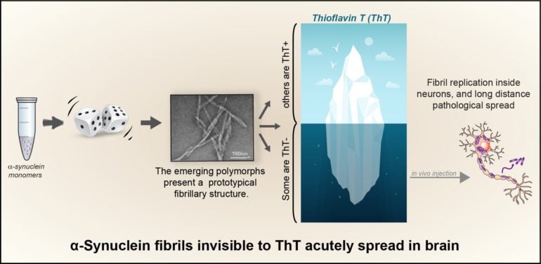 This discovery is of particular importance for the research on synucleinopathies: since the primary monitoring of alpha-synuclein fibril formation with ThT is a consensus reference method, this has led to ignoring Tht negative polymorphs and focused most research efforts only on the tip of the iceberg, i.e., the sole Tht-positive fibrils.