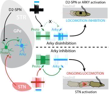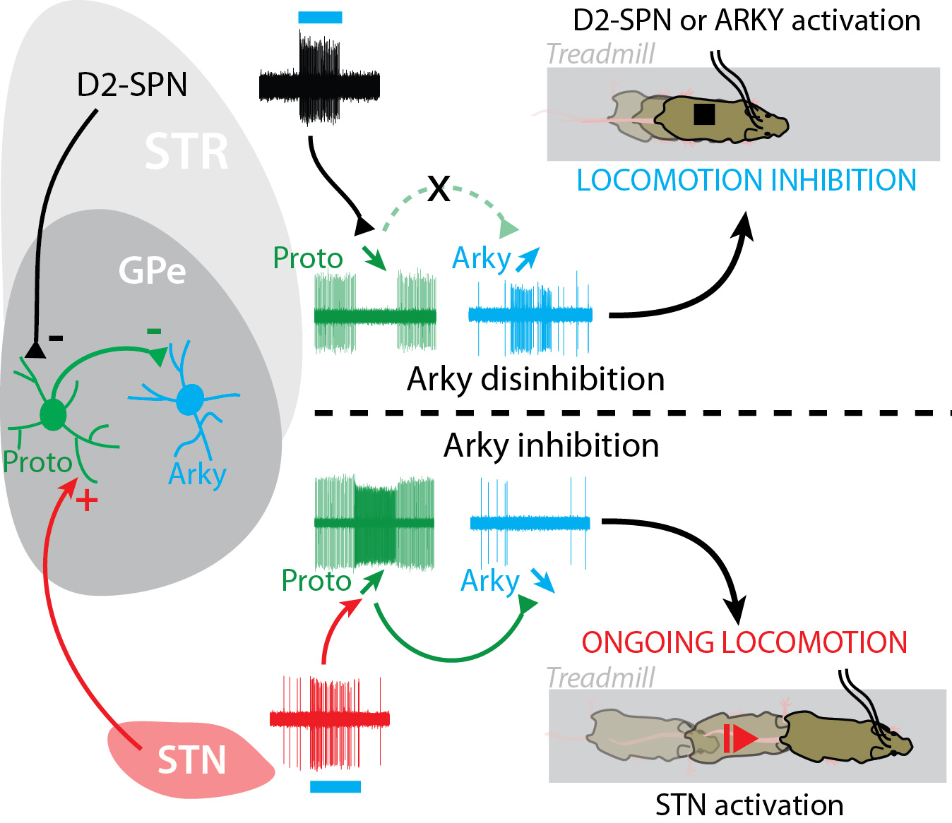 The basal ganglia play a crucial role in controlling locomotion as best evinced by the motor symptoms present in Parkinson’s disease following their dysfunctions. However, the neuronal mechanisms involved in such locomotor control are not precisely known. In this paper authored by Asier Aristieta et al., we discovered a novel basal ganglia circuit mechanism that, when recruited, causes a powerful and global state of motor suppression. Our work calls for a re-evaluation of basal ganglia functional organization that should account for the critical role played by globus pallidus arkypallidal neurons in action selection/cancellation. This publication results from co-investigations within two teams of the IMN (J. Baufreton and N. Mallet) and a collaboration with the AniMotion collaborative platform from INCIA (G. Barrière/G. Courtand).