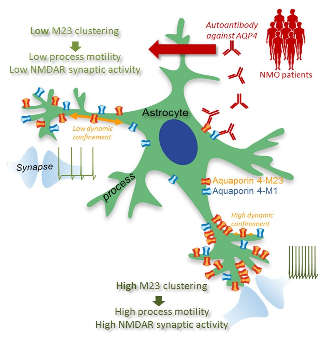 Based on the long-standing collaboration between Groc’s and Oliet’s labs, Silvia Ciappelloni and collaborators use an array of fluorescent imaging approaches to investigate how astrocytes control the dynamics of their highly-ramified processes. Indeed, astrocytes constantly adapt their ramified morphology in order to support brain cell assemblies. Such plasticity is partly mediated by ion and water fluxes, which rely on the water channel aquaporin-4 (AQP4). The mechanism by which this channel locally contributes to process dynamics was quite elusive. Here, we investigated in hippocampal astrocytes the dynamic distribution of the AQP4 isoforms, i.e. M1 and M23. Surface AQP4-M1 formed small aggregates that contrast with the large AQP4-M23 clusters that are enriched near glutamatergic synapses. Strikingly, stabilizing surface AQP4-M23 tuned the motility of astrocyte processes and favors glutamate synapse activity. Furthermore, human autoantibodies directed against AQP4 from neuromyelitis optica patients impaired AQP4-M23 dynamic distribution and, consequently, astrocyte process and synaptic activity. Collectively, we thus propose that the membrane dynamics of AQP4 isoform regulate brain cell assemblies in health and autoimmune brain disease targeting AQP4.