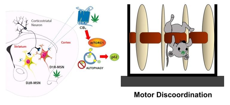 We showed that Δ9-tetrahydrocannabinol, the major psychoactive ingredient of cannabis, impairs autophagy and accumulates P62 protein in neurons of the striatum, a brain area that plays a key role in the control of motor coordination. Second, we demonstrate that boosting autophagy, either by pharmacological manipulation (with the FDA-approved mammalian target of rapamycin inhibitor temsirolimus) or by dietary intervention (with the natural, non-toxic disaccharide trehalose), rescues the Δ9-tetrahydrocannabinol-induced impairment of striatal autophagy and motor coordination in mice. Furthermore, we provide evidence that cannabinoid CB1 receptors located on neurons of the striatal direct (stratonigral) pathway, by coupling to mammalian target of rapamycin activation and autophagy inhibition, are indispensable for the motor dyscoordinating activity of Δ9-tetrahydrocannabinol in mice.