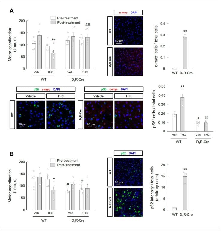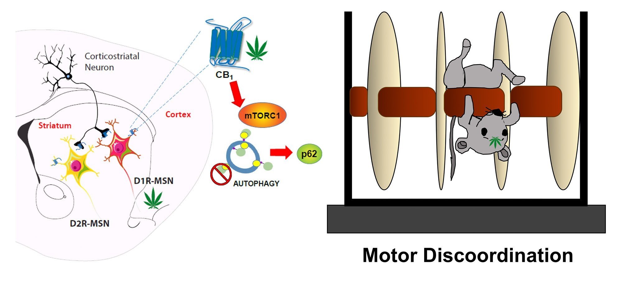 Last but not least, using viral mediated genetic manipulation of striatonigral neurons we confirmed that disrupting mammalian target of rapamycin pathway, as well as boosting P62 accumulation in these cells, completely prevents Δ9-tetrahydrocannabinol-induced impairment of striatal autophagy and motor dyscoordination in mice.