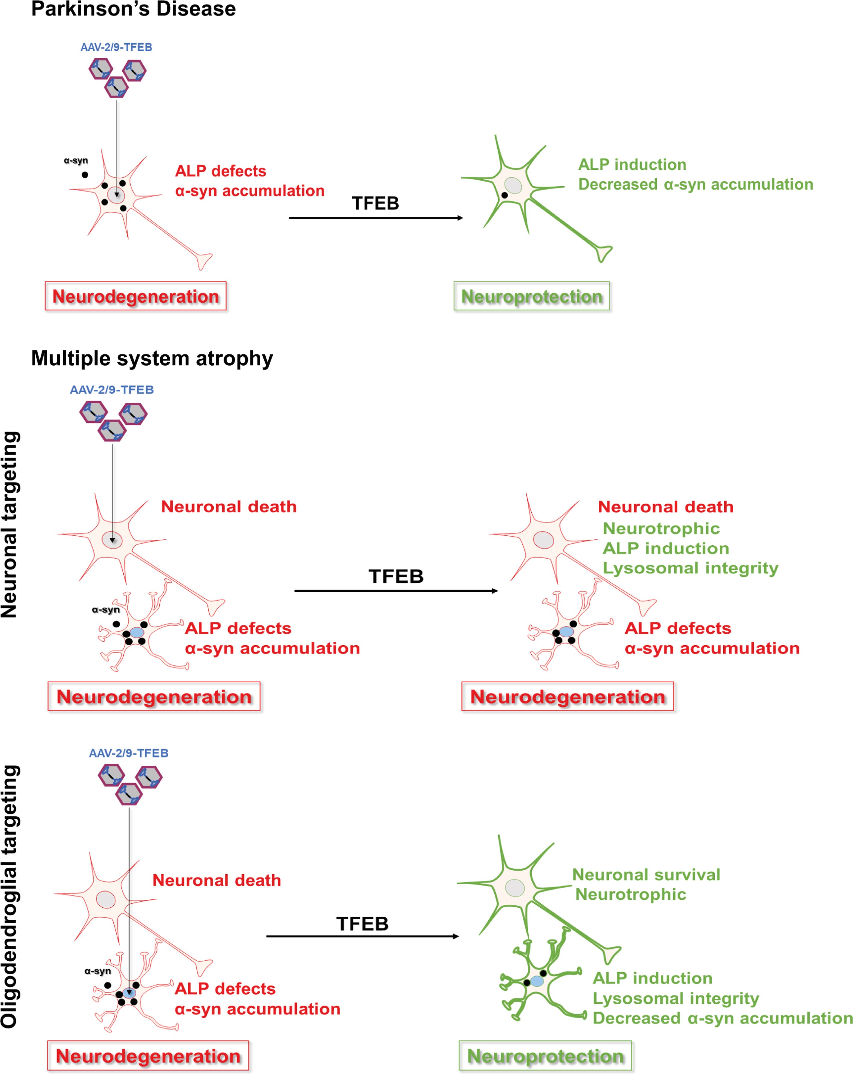 The synucleinopathies Parkinson’s disease (PD) and Multiple system atrophy (MSA) — characterized by α-synuclein intracytoplasmic inclusions into, respectively, neurons and oligodendrocytes — are associated with impairment of the autophagy-lysosomal pathways (ALP). Increased expression of the master regulator of ALP, transcription factor EB (TFEB), is hypothesized to promote the clearance of WT α-synuclein and survival of dopaminergic neurons. Here, we explore the efficacy of targeted TFEB overexpression either in neurons or oligodendrocytes to reduce the pathological burden of α-synuclein in a PD rat model and a MSA mouse model. While TFEB neuronal expression was sufficient to prevent neurodegeneration in the PD model, we show that only TFEB oligodendroglial overexpression leads to neuroprotective effects in the MSA model. These beneficial effects were associated with a decreased accumulation of α-synuclein into oligodendrocytes through recovery of the ALP machinery. Our study demonstrates that the cell type where α-synuclein aggregates dictates the target of TFEB overexpression in order to be protective, paving the way for adapted therapies.
