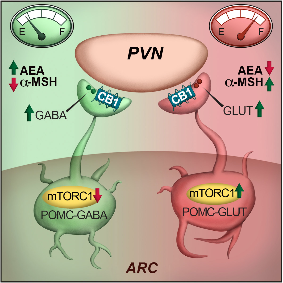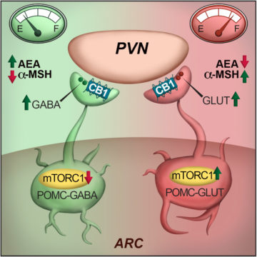 In an article published in Cell Reports, Saucisse et al. studied the role of the mechanistic target of rapamycin complex 1 (mTORC1) pathway within POMC neurons. mTORC1 is a ubiquitous protein complex acting as a nutrient and energy sensor for cells. The authors hypothesized that its role in POMC neurons could have whole-body consequences by allowing POMC neurons to determine the energy needs of the whole organism and match energy intake and use accordingly. First, they showed that the blockade of mTORC1 specifically in POMC neurons causes hyperphagia. This was associated with decreased POMC-derived appetite suppressant α-melanocyte-stimulating hormone and recruitment of POMC/GABAergic neurotransmission, which is restrained by cannabinoid type 1 receptor signalling.