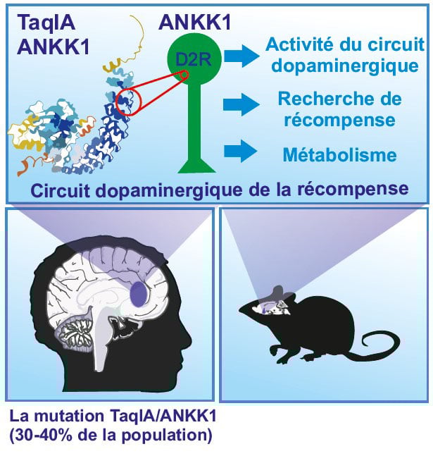 Dans cette étude, les scientifiques ont développé un modèle murin dont le gène Ankk1 est invalidé dans le système nerveux central. Ils montrent que, chez la souris, la délétion de ce gène dans des régions clés du système de la récompense induit des perturbations du comportement comparables aux phénotypes des porteurs de TaqIA A1. Ils démontrent ainsi pour la première fois un rôle clé de cette protéine dans les mécanismes réglant la réponse à la récompense. De plus les scientifiques ont découvert chez le rongeur une modification du métabolisme des lipides à l’échelle de l’organisme associée à la perte d’Ankk1. Ils ont également démontré dans cette même étude que la variation de ce polymorphisme chez l’homme se traduit aussi par un phénotype métabolique similaire.