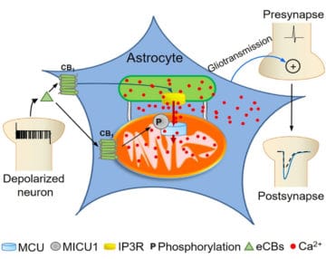 Astrocytes are key players in the regulation of synaptic transmission and plasticity. Detection of synaptic activity by astrocytes and subsequent release of gliotransmitters involve changes in astroglial Ca2+ signalling. However, how increases of Ca2+ in these cells translate into specific actions to modulate neuronal functions is largely unknown. This study shows a fully new mechanism linking the activation of CB1 receptors to the ability of mitochondria to regulate the dynamics of intracellular Ca2+.