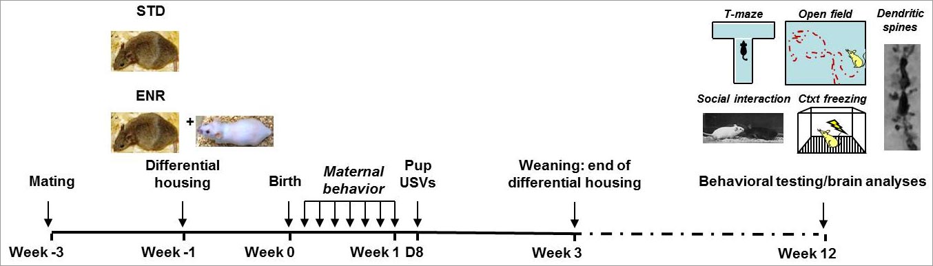 Converging lines of evidence support the use of environmental stimulation to ameliorate the symptoms of a variety of neurodevelopmental disorders. Applying these interventions at very early ages is critical to achieve a marked reduction of the pathological phenotypes. In collaboration with Dr. Francesca D’amato at the CNR of Rome we evaluated the impact of early social enrichment in Fmr1-KO mice, a genetic mouse model of fragile X syndrome (FXS), a major developmental disorder and the major monogenic cause of autism. Enrichment was achieved by providing male KO pups and their WT littermates with enhanced social stimulation, housing them from birth until weaning with the mother and an additional non-lactating female.