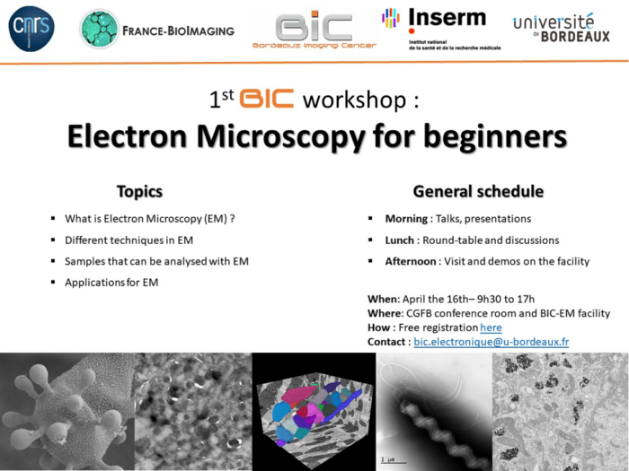 The first workshop will be : “Electron microscopy for beginners“. It will take place on April 16th, in CGFB conference room and BIC Electron microscopy unit.