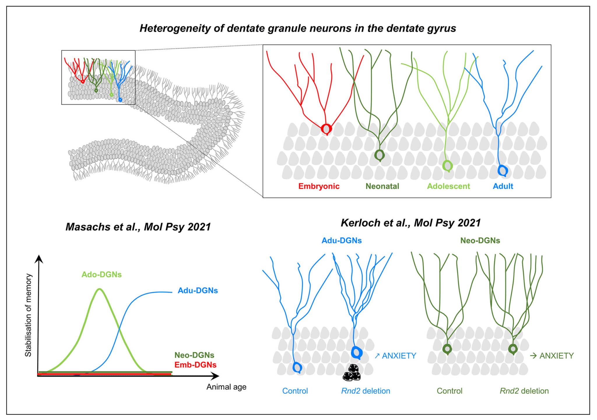 The temporal origin of dentate granule neurons dictates their role in spatial memory. Masachs N, Charrier V, Farrugia F, Lemaire V, Blin N, Mazier W, Tronel S, Montaron MF, Ge S, Marsicano G, Cota D, Deroche-Gamonet V, Herry C, Abrous DN. Mol Psychiatry. 2021 Sep 15.
