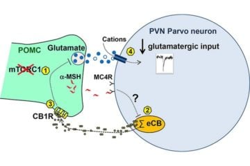 Acute pharmacological inhibition of mTORC1 in C57BL/6J mice decreased glutamatergic inputs onto the PVN via a mechanism requiring modulation of MC4R, endocannabinoid 2-AG mobilization by PVN parvocellular neurons, and retrograde activation of presynaptic CB1R. Further electrophysiology studies using mice lacking mTORC1 activity or CB1R in POMC neurons indicated that the observed effects involved mTORC1 and CB1R-dependent regulation of glutamate release from POMC neurons. Finally, energy surfeit caused by hypercaloric high-fat diet feeding, rapidly and time-dependently altered the glutamatergic inputs onto parvocellular neurons and the ability of mTORC1 and CB1R signaling to modulate such excitatory activity.