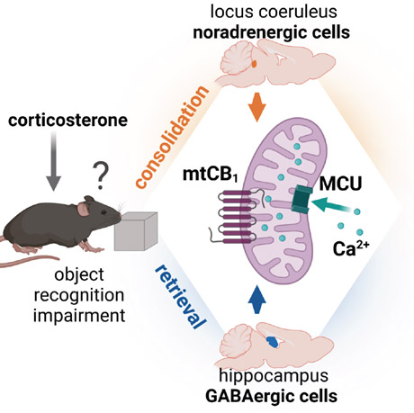 Les auteurs ont montré que l’injection de corticostérone, une des hormones du stress, altère la capacité des souris à reconnaître un objet précédemment présenté au cours de deux phases différentes de la mémorisation, nommément la consolidation, lorsque l’information acquise est stockée par les circuits cérébraux, et la récupération, qui est le processus d’accès aux souvenirs ainsi stockés. Curieusement, les récepteurs CB1 mitochondriaux sont nécessaires à l’altération négative de la mémoire par la corticostérone, mais dans des types de cellules et des régions cérébrales différents pour chacun des deux processus mnésiques. En effet, l’altération de la consolidation est médiée par les récepteurs CB1 mitochondriaux dans les cellules noradrénergiques provenant du locus coeruleus alors que l’altération de la récupération de la mémoire est médiée par les récepteurs CB1 mitochondriaux dans les neurones GABAergiques de l’hippocampe.