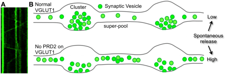 Figure: VGLUT1 réduit le super-contingent de vésicules synaptiques et la libération spontanée de glutamate. A: Exemple d’analyse du super-contingent de vésicules mobiles à l’aide d’un kymographe. B: Représentation schématique de l’effet du domaine riche en prolines (PRD2) sur l’homéostasie axonale des vésicules synaptiques et la libération spontanée de glutamate. Copyrights : Etienne HERZOG
