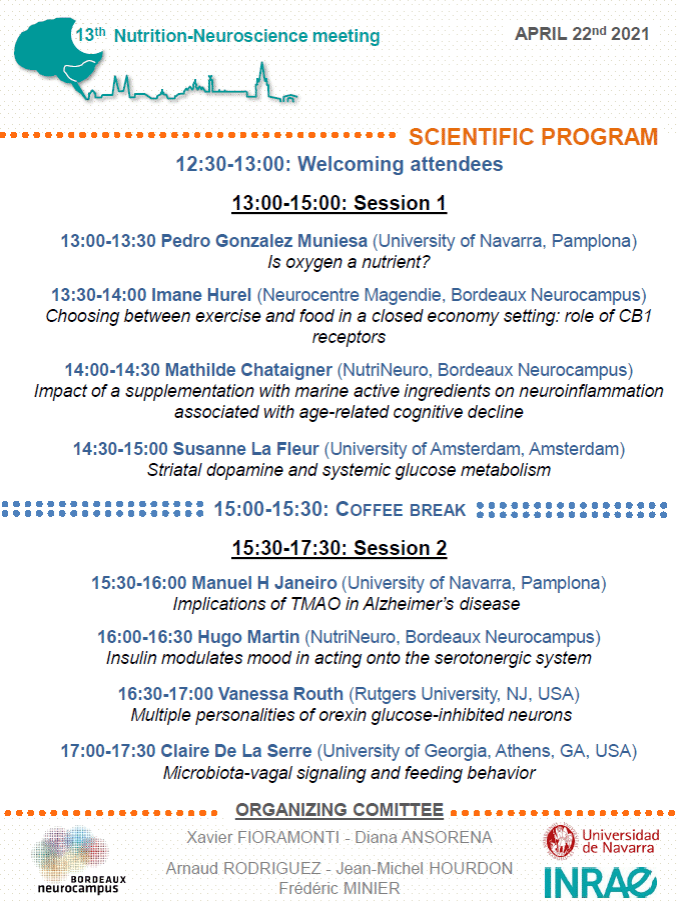 The 13th edition of nutrition-neuroscience meeting will take place online , Thursday 22 April 2021.