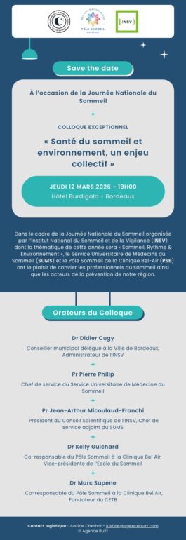 Dans le cadre de la Journée Nationale du Sommeil organisée par l’Institut National du Sommeil et de la Vigilance (INSV), dont la thématique de cette année sera « Sommeil, Rythme & Environnement », le Service Universitaire de Médecine du Sommeil (SUMS) et le Pôle Sommeil de la Clinique Bel-Air (PSB) ont le plaisir de convier les professionnels du sommeil ainsi que les acteurs de la prévention de notre région.