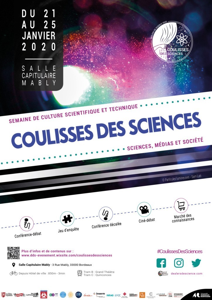 Les étudiants du master Médiation des sciences, de l’Université Bordeaux Montaigne, membres de l’association les Dealers de Science organisent « Coulisses des sciences », un événement de culture scientifique et technique ouvert à tous, à Bordeaux du 21 au 25 janvier 2020.