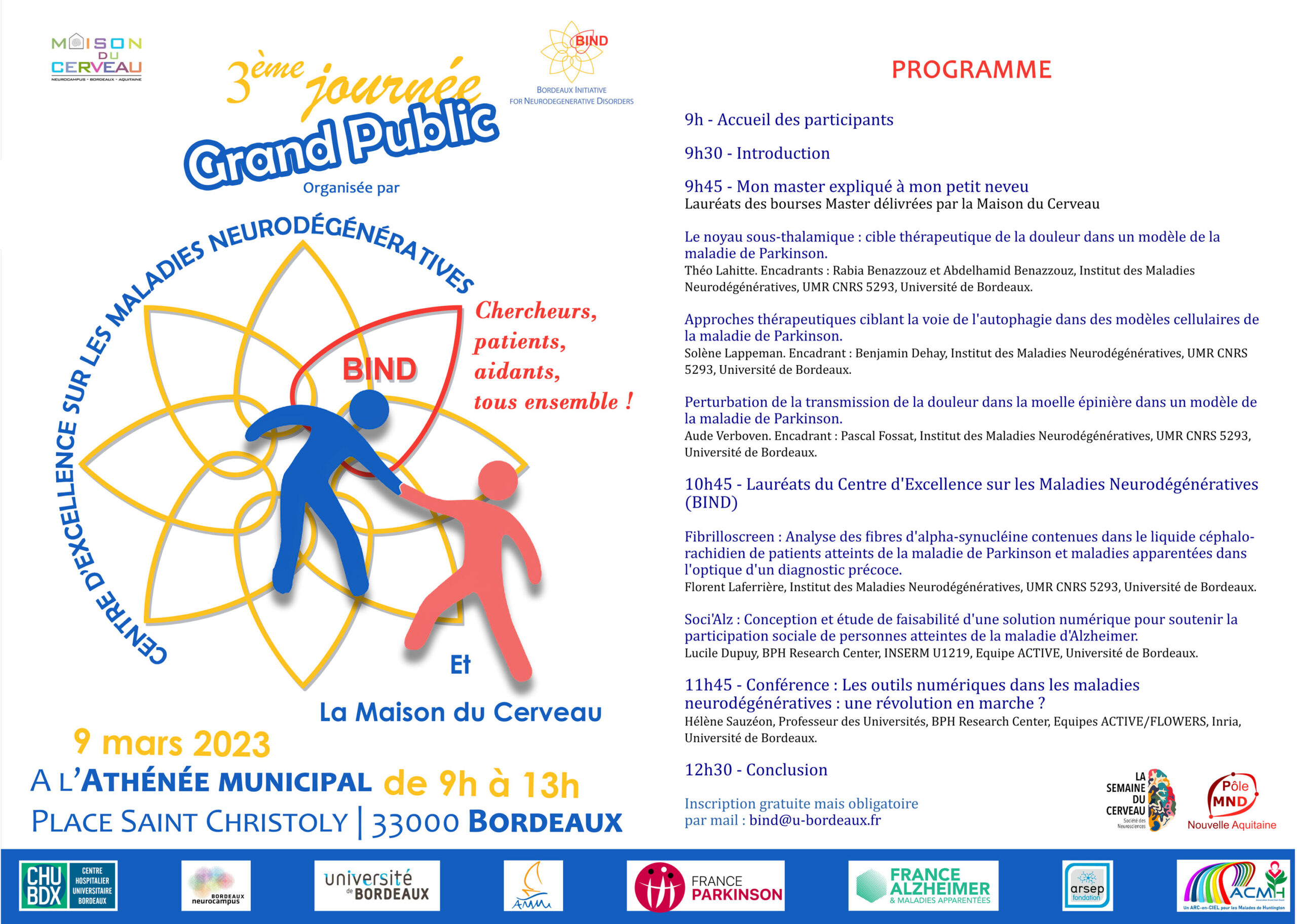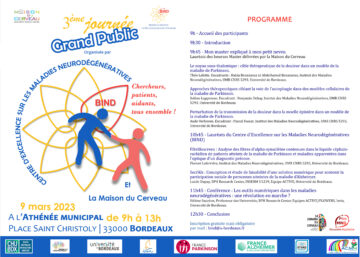 Le Centre d’Excellence sur les maladies neurodégénératives de Bordeaux (BIND) et l’association Maison du Cerveau organisent leur troisième journée Grand Public sur le thème :