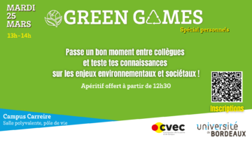 Dans le cadre de la Semaine de l’Écologie et de la Solidarité (SES), un Green Games Numérique sera organisé pour les personnels de l’université. Ce jeu, qui inclut des lots à la clé, consiste en un quiz interactif sur les enjeux environnementaux et sociétaux.
