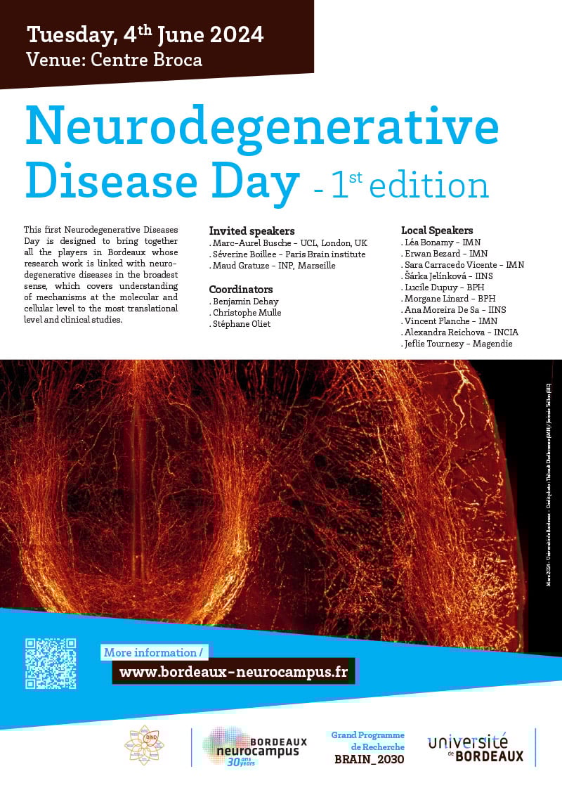 This first Neurodegenerative Diseases Day is designed to bring together all the players in Bordeaux whose research work neurodegenerative diseases in the broadest sense, which covers understanding of mechanisms from the molecular and cellular level to the most translational level translational to clinical studies.