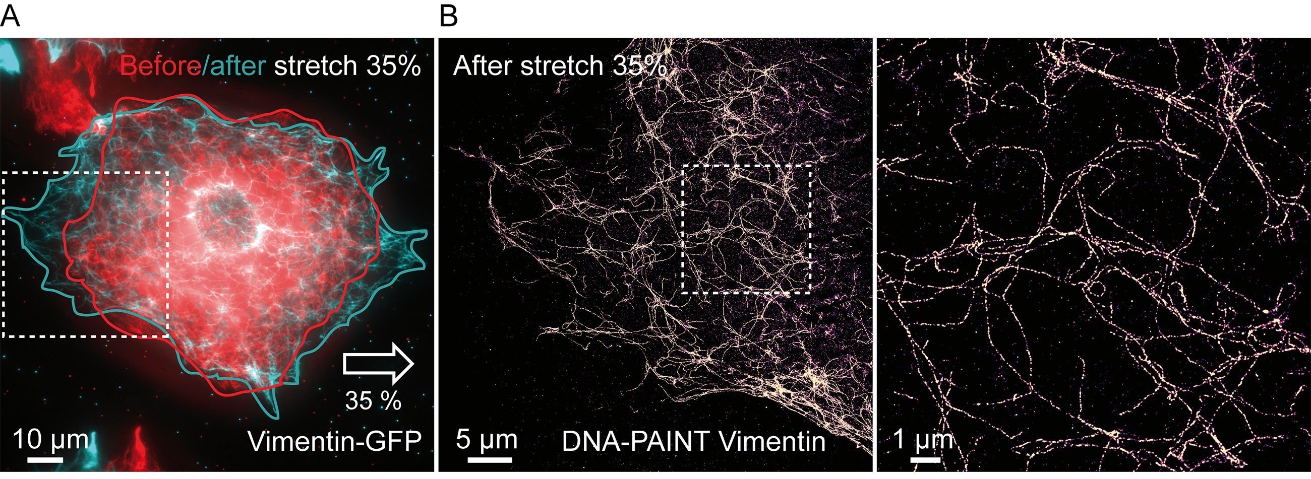 Des études antérieures réalisées sur des protéines purifiées ont montré que la mécanosensibilité cellulaire repose sur la déformation et la réorganisation des protéines. Donc, le consensus général est qu’un stress mécanique externe appliqué aux cellules est directement et instantanément transmis aux protéines au sein des structures adhésives et du cytosquelette. Dans cette étude, des chercheurs de l’IINS, du LP2N, du LPTMC et de l’Institut Pasteur ont révélé pour la première fois la réponse mécanique des protéines individuelles en combinant l’étirement cellulaire sur des substrats élastiques avec la microscopie super-résolutive. Certaines protéines, comme les protéines d’adhésion, suivent le déplacement élastique du substrat. D’autres, comme les protéines connectées au cytosquelette, ont un comportement inélastique, car elles continuent à être déformées ou réorganisées alors même que le substrat n’est plus étiré. Ces résultats démontrent que la réponse mécanique des protéines n’est pas obligatoirement déclenchée par une transmission directe des forces externes. Au contraire, une contrainte mécanique externe déclenche une réponse active et déphasée de la cellule. Ceci permet d’amplifier des stimuli mécaniques faibles pour déformer ou recruter des protéines lors de la mécanosensibilité cellulaire. La combinaison de l’étirement cellulaire et de la microscopie super-résolutive permettra de déchiffrer les mécanismes moléculaires à la base du fonctionnement d’autres structures mécanosensibles tels que la membrane cellulaire ou le noyau.