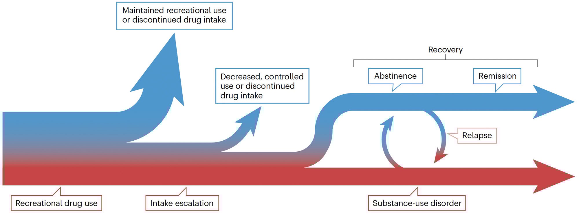 Evolution of drug use. After the first few experiences with a drug, most people (between 70% and 95% depending on the drug) either maintain a recreational use of the drug or do not continue to consume it. Some individuals, however, progressively escalate their intake. Some of these people may eventually decrease or even stop using the drug, while others transition to substance-use disorder (SUD; between 5% and 30%, depending on the drug). Some people with SUD enter an abstinence phase during which they discontinue using the drug. However, many of them may fail to maintain abstinence and may relapse to drug use. This abstinence/relapse cycle can repeat over time (on average between 2 to 5 cycles). After several years (4 to 30, depending on the drug) about 50% of people with SUD show recovery and may eventually enter remission. Although the proportion of people in recovery may increase with time after the onset of SUD, a subset may never achieve remission (putatively <20%). Adapted from Engeln and Ahmed, Nature Reviews Neuroscience; 10.1038/s41583-024-00886-y