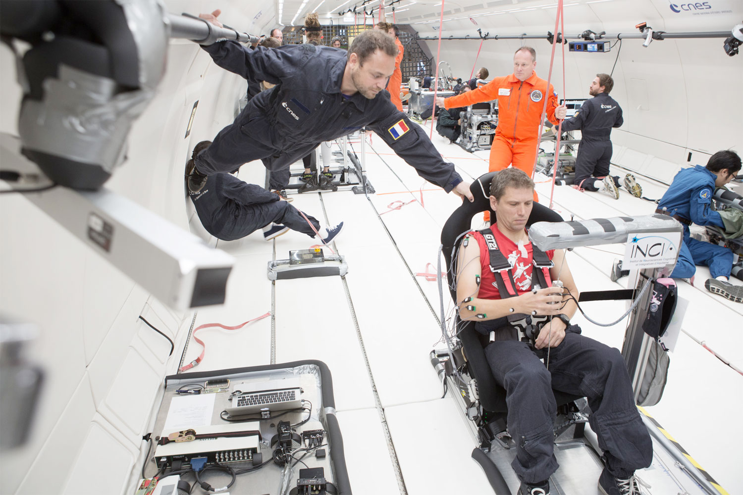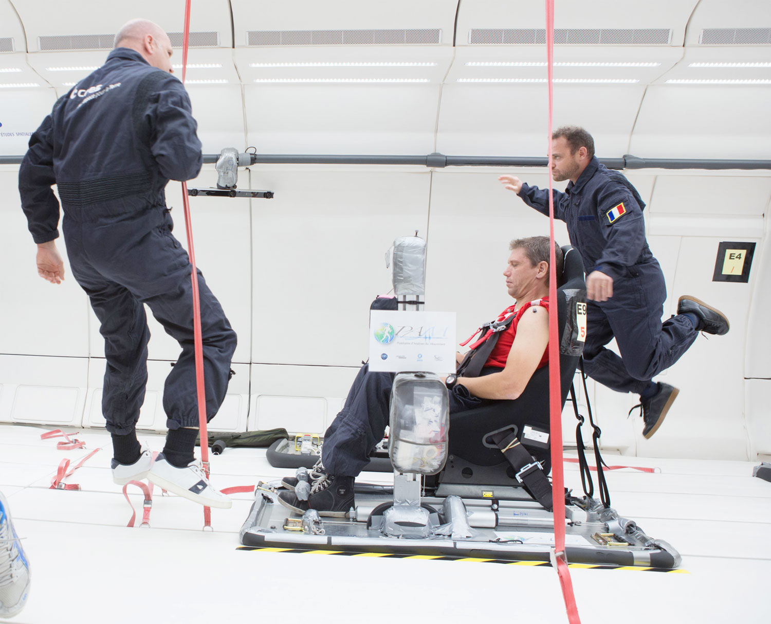 En collaboration avec la Plateforme d’Analyse du Mouvement (Etienne GUILLAUD) qui a déjà réalisé plusieurs expériences en micropesanteur, l’équipe HYBRID vient de finir une campagne de vols paraboliques avec NOVESPACE et le CNES (Centre National des Etudes Spatiales). Le projet GENEPI (Grasping Evaluation in New Environment for Proprioception Investigation) conduit par Florent PACLET (coordinateur scientifique) et Etienne GUILLAUD (coordinateur technique) a embarqué 2 sujets et 2 expérimentateurs par vols sur 3 jours afin de déterminer quels sont les réponses du système nerveux aux différentes contraintes de pesanteur.Les résultats sont en cours de traitement et le CNES a accepté notre demande à la participation d’une seconde campagne en avril 2017″