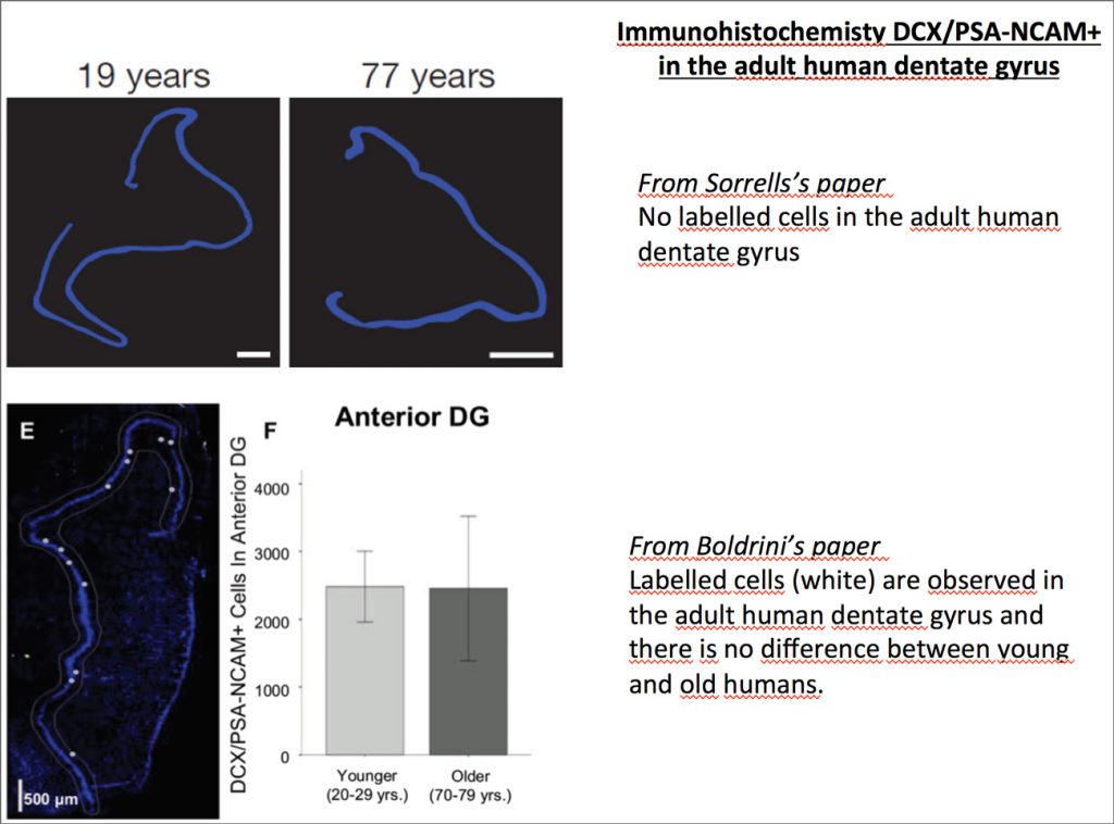 Earlier this year, Sorrells and al. published a paper titled: “Human hippocampal neurogenesis drops sharply in children to undetectable levels in adults”. Needless to say, this paper acted like a bombshell for the Neuroscience community, the neurogenesis field in particular. The paper even enticed many discussions within the non-scientific community due to various publications of articles covering it in multiple newspapers, such as: “Le Monde”. Nevertheless, the story does not stop here, a few weeks later Boldrini and al. published a study with opposite conclusion in a paper called “Human Hippocampal Neurogenesis Persists throughout Aging”. Then, what do we have to say about these two papers? Is the latter paper enough to give a full relieve for neuroscientists working on neurogenesis? How should we, as a scientific community, respond and draw conclusion from both publications?