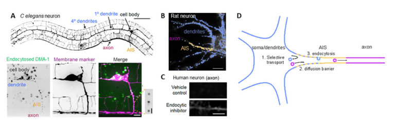 Dans le cadre d’une collaboration avec l’Université de Stanford en Californie, des chercheurs de l’uipe de David Perrais (IINS) ont identifié un troisième mécanisme de préservation de la polarité des neurones : l’internalisation des protéines de surface dendritiques par endocytose et leur dégradation dans le SIA. Pour parvenir à cette conclusion, ils ont utilisé trois modèles biologiques. Tout d’abord, ils ont étudié certains neurones du ver nématode Caenorhabditis elegans, un ver d’un millimètre de long qui est l’un des systèmes modèles les plus étudiés par les biologistes. En concentrant leur étude sur l’un des 302 neurones de ce ver, les scientifiques ont montré que ce neurone possède un AIS et que le blocage de l’endocytose spécifiquement dans ce neurone provoque la redistribution d’une protéine de surface dendritique appelée DMA-1 vers l’axone. De plus, cette protéine, qui est responsable de la formation des branches dendritiques, provoque la formation ectopique de branches normalement absentes dans l’axone lorsqu’elle est présente dans l’axone. Ils ont également montré que l’endocytose joue le même rôle pour les protéines de surface dendritiques dans les neurones humains, ainsi que dans les neurones de rongeurs. Les scientifiques ont également directement visualisé l’endocytose du SIA à l’aide d’une méthode d’imagerie par fluorescence permettant de détecter la formation de vésicules d’endocytose en temps réel (voir Sposini et al. 2020) pour montrer que les protéines de surface dendritiques sont effectivement internalisées dans l’AIS des neurones, et que la fréquence de formation de vésicules d’endocytose est la même que dans les dendrites.
