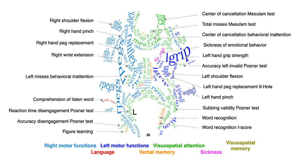 Nous présentons ici un nouveau cadre prédictif, le disconnectome symptoms discoverer pour prédire les scores neuropsychologiques un an après l’AVC basé sur les données d’imagerie cérébrale et de neuropsychologie recueillies sur près de 2000 patients. Cette avancée scientifique n’a été possible que grâce à la prise en compte de l’organisation du cerveau en circuits, négligée dans les efforts d’analyse de prédiction précédente. En reliant cet espace aux résultats neuropsychologiques, nous obtenons des informations biologiques qui sont disponibles sous la forme du premier atlas complet des relations entre les lésions des circuits cérébraux et le déficit sur 86 scores – un atlas neuropsychologique de la substance blanche. Notre nouveau cadre prédictif, a obtenu de meilleures performances de prédiction que six autres modèles, dont la déconnexion fonctionnelle, la topologie des lésions et la modélisation du volume. La prédiction hors échantillon dérivée de cet atlas a présenté une erreur absolue moyenne inférieure à 20 % et a permis des prédictions neuropsychologiques personnalisées. Ces prédictions ont également été validées sur une cohorte externe pour la fluidité sémantique. En outre, l’entraînement du modèle et sa validation ont également été reproduits sur deux cohortes externes.