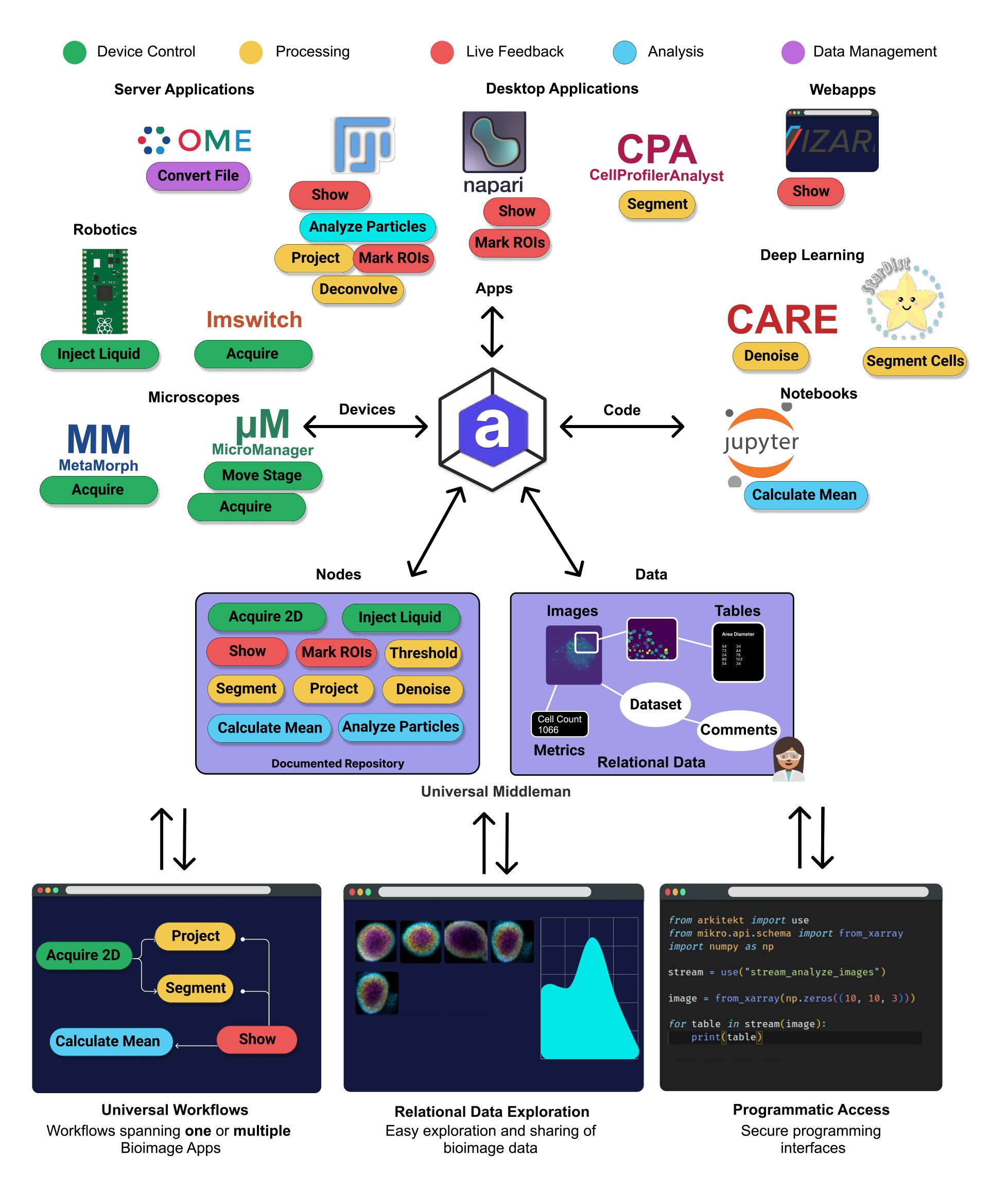 Quantitative microscopy workflows have evolved dramatically over the last years, progressively becoming more complex with the emergence of deep learning. Long-standing challenges like 3D segmentation of complex microscopy data can finally be addressed, and new imaging modalities are breaking records in both resolution and acquisition speed, generating gigabytes if not terabytes of data per day. With this shift in bioimage workflows comes an increasing need for efficient orchestration and data management, necessitating multi-tool interoperability and the ability to span dedicated computing resources. However, existing solutions are still limited in their flexibility and scalability and are usually restricted to off-line analysis. Here, we introduce Arkitekt, an open-source middleman between users and bioimage apps that enables complex quantitative microscopy workflows in real time. It allows orchestrating popular bioimage software locally or remotely in a reliable and efficient manner. It includes visualization and analysis modules, but also mechanisms to execute source code and pilot acquisition software, making ‘smart microscopy’ a reality.